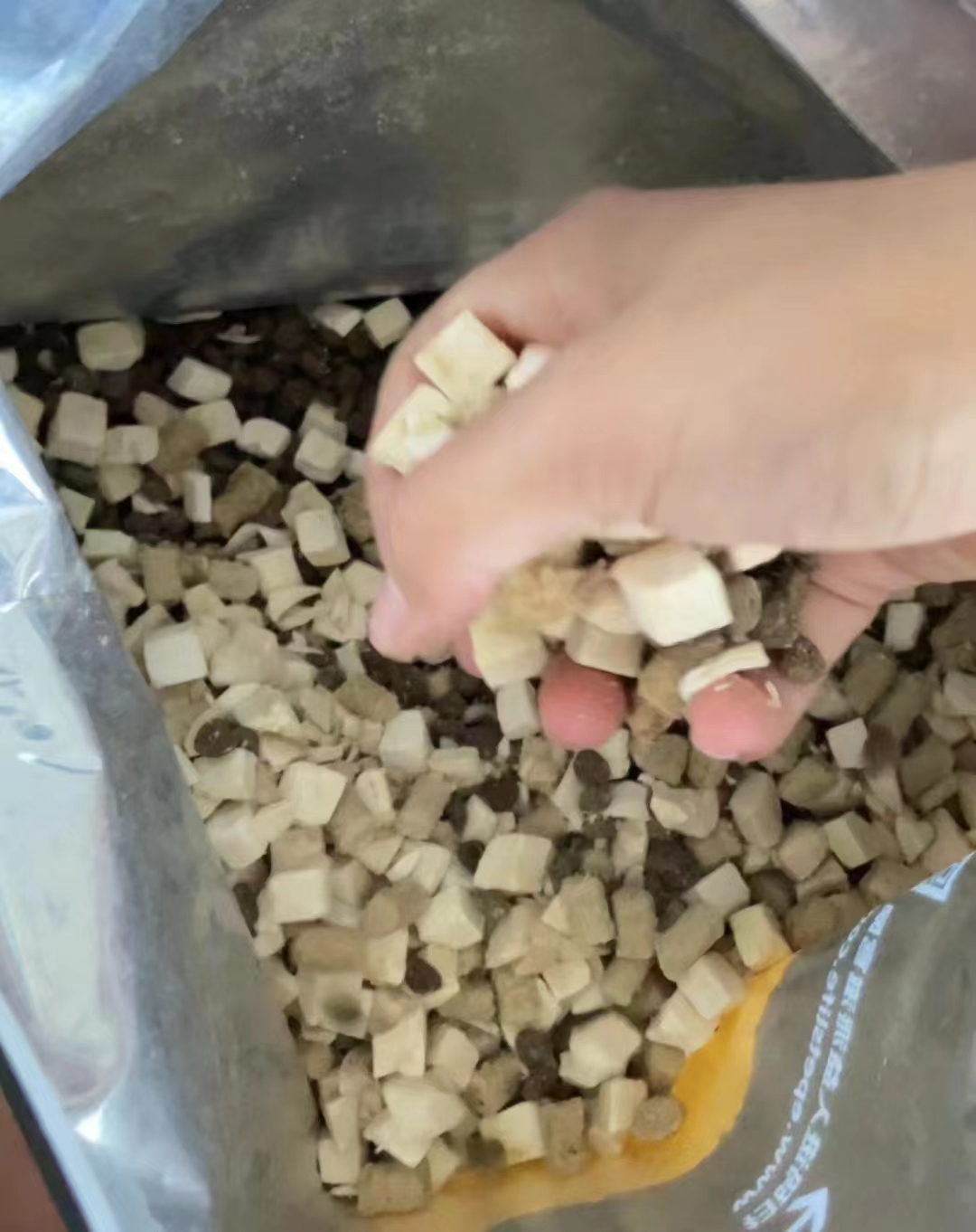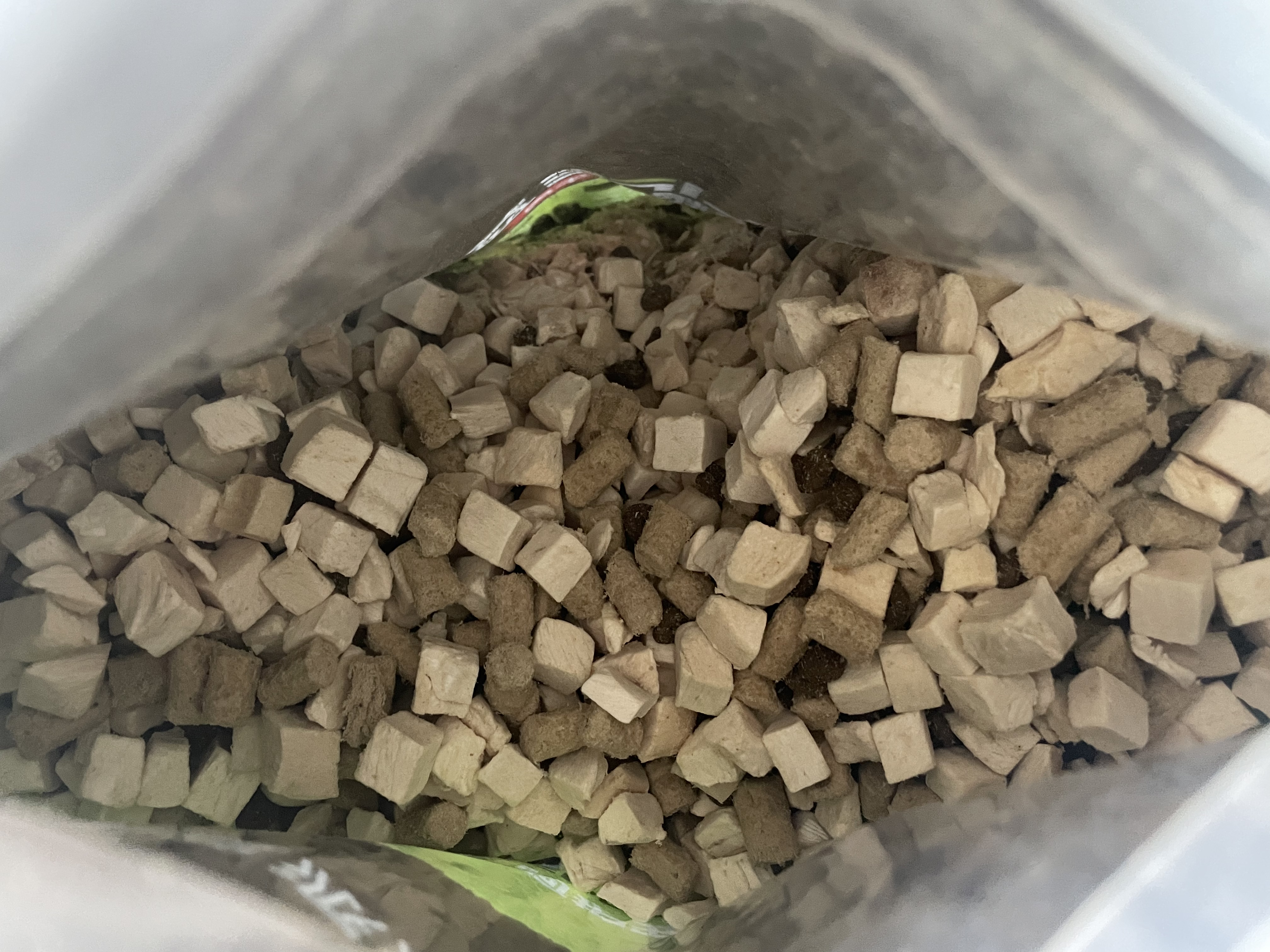 家人们,真的没想到,这个粮也太香了,打开满满的冻干,没忍住吃了一块鸡肉冻干,没有咸味,干倒是还行,就是鸡肉的香味,我家两小只真的喜欢吃,非常推荐家人们